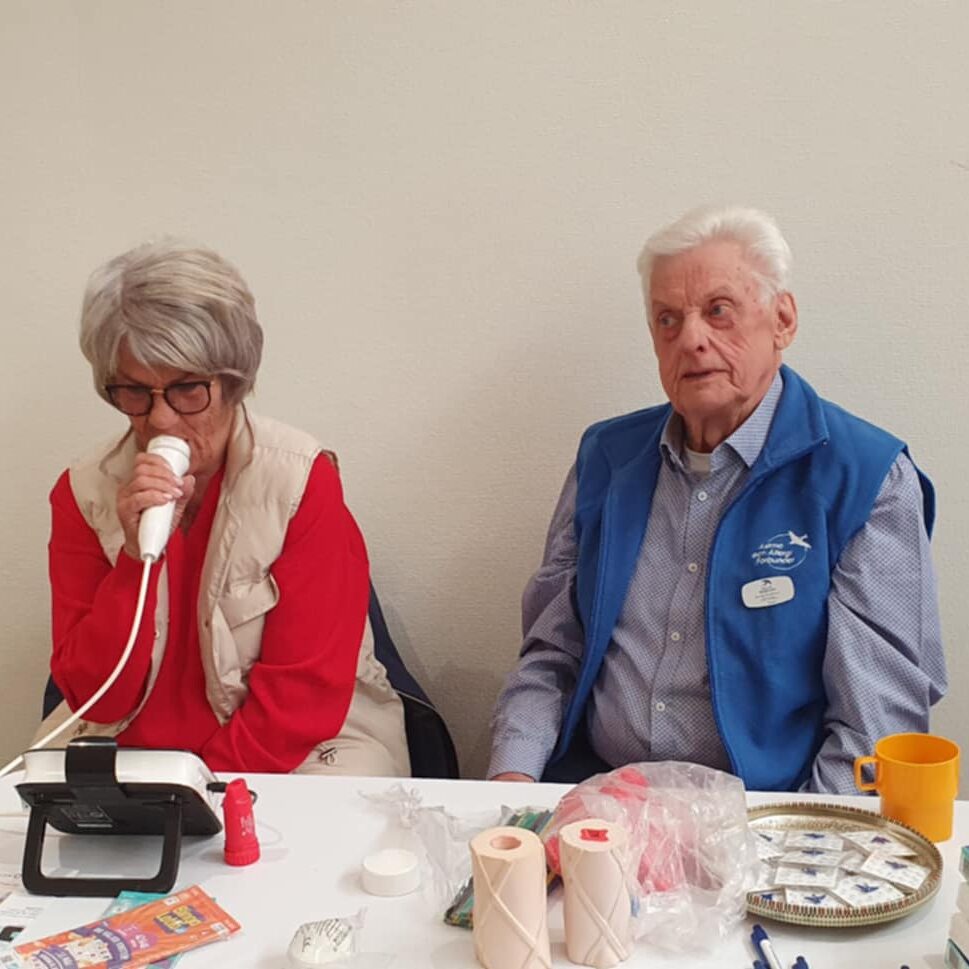 Efter No-mätningen fick några besökare tid till astmasjuksköterskan för vidare uppföljning av sina problem…personen på bilden ville bara testa av ren nyfikenhet, vad jag minns blev resultatet även till allas belåtenhet!